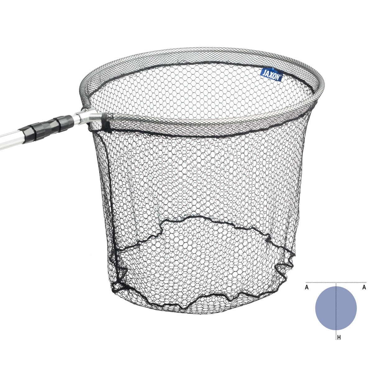 Landing nets with telescopic handle and stiff round frame.