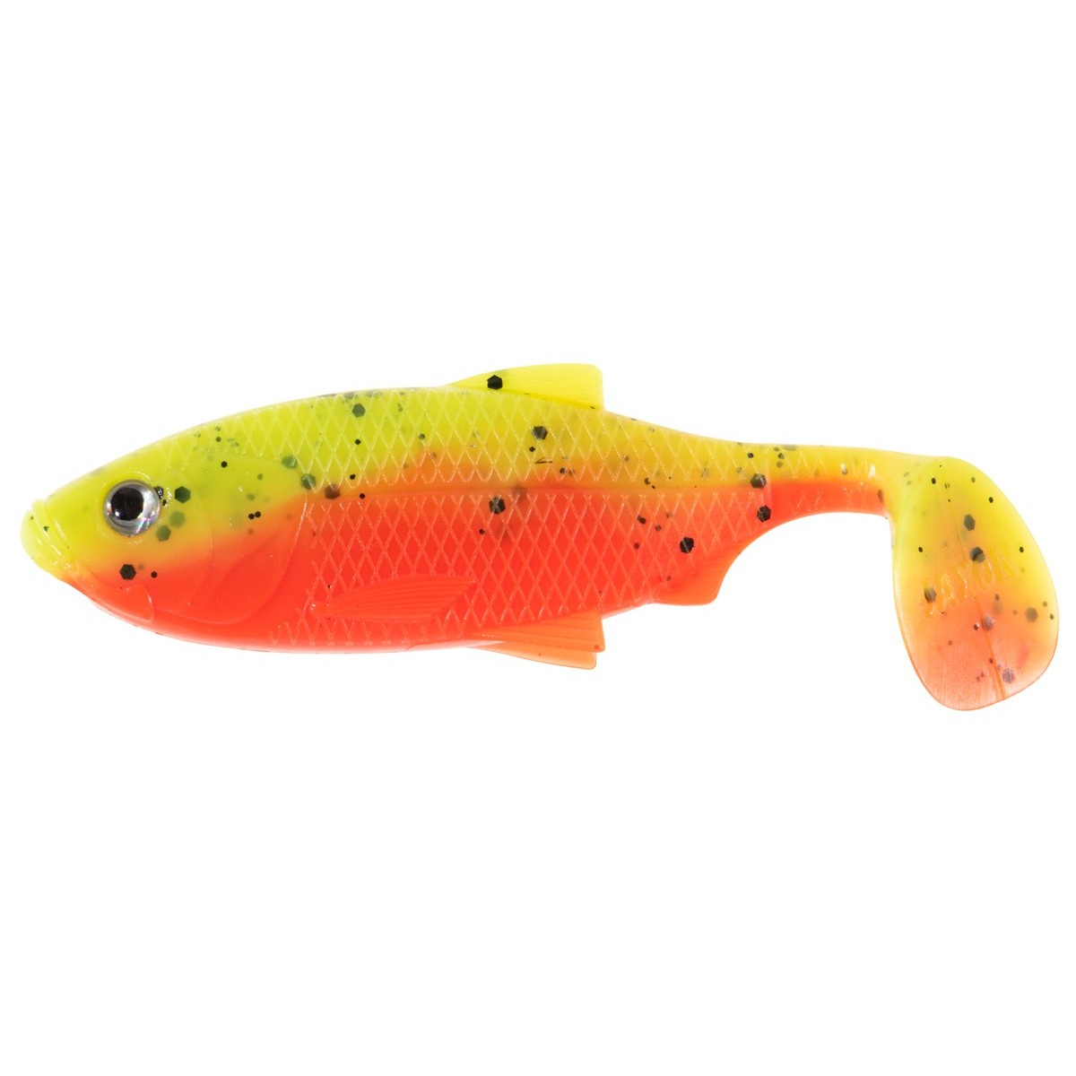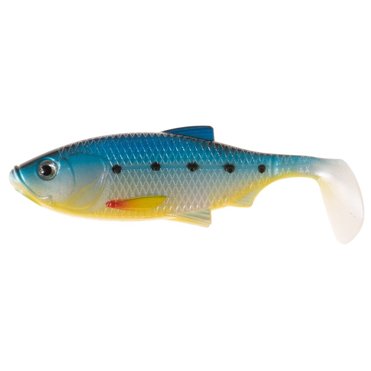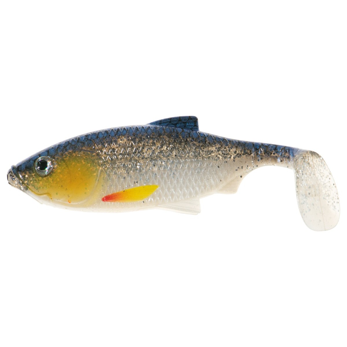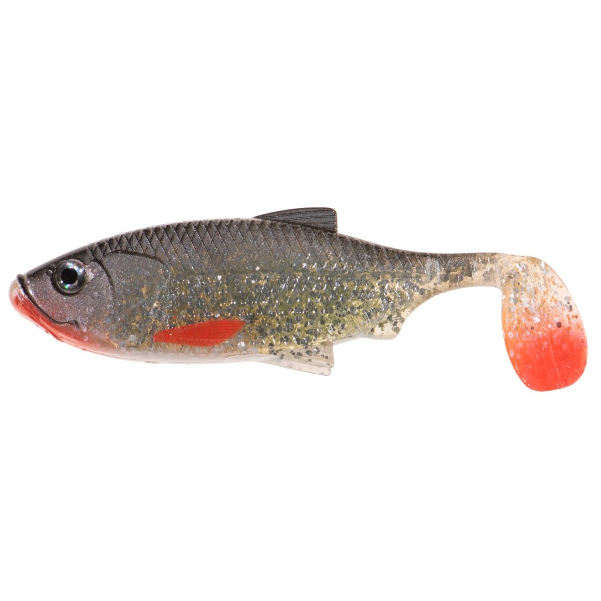 The inspiration for creating this lure was nature, specifically small silver bream fry, which is great for many predators, especially perch and zander. We have carefully attended to the details: realistic scale texture, lateral line, fins, and expressive eyes make the lure look lifelike. The combination of a soft body with tail constrictions and a large paddle tail guarantees both active tail action and excellent wobble and flashing body action.