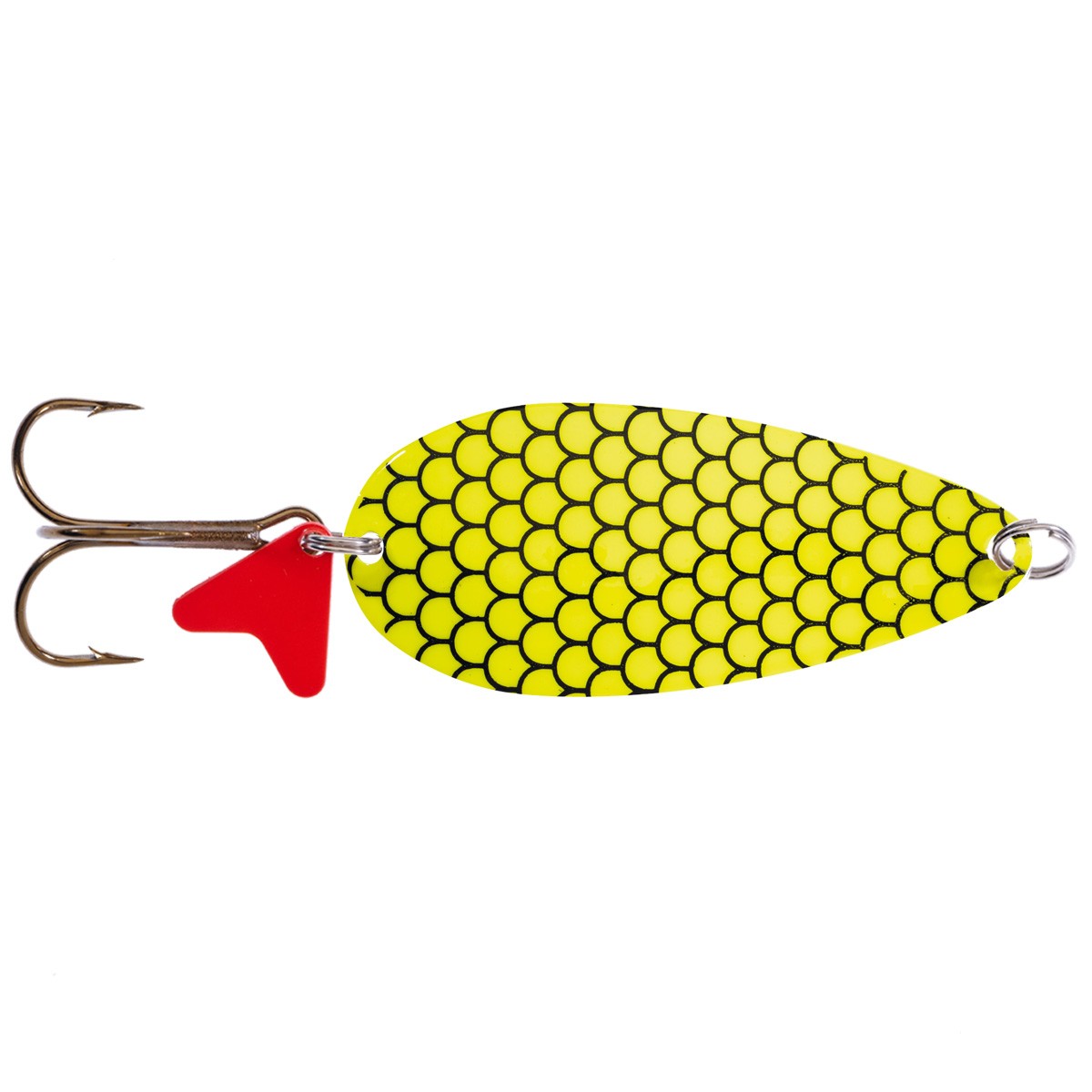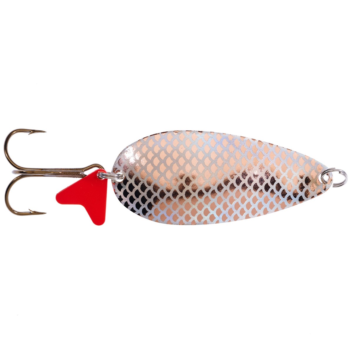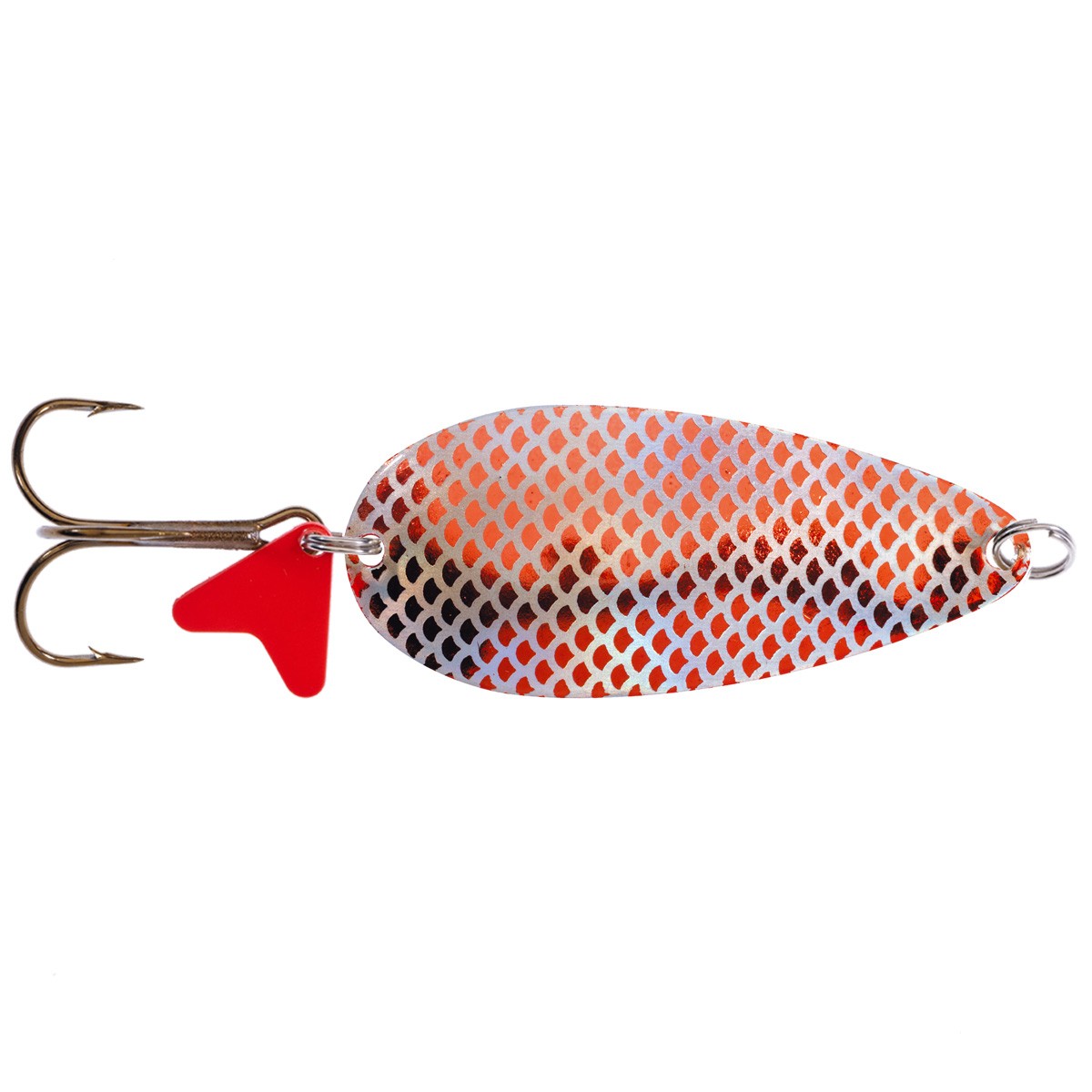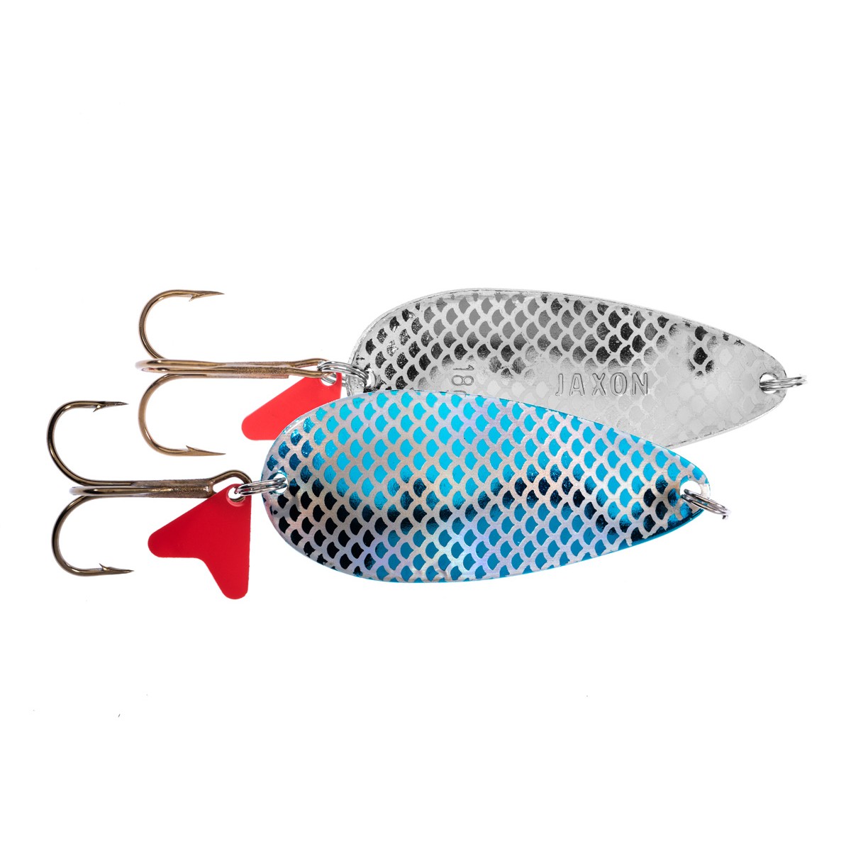 HS KARAŚ RAB Błystki wahadłowe z motywem rybiej łuski, charakteryzujące się różnymi dwoma kolorami po każdej ze stron. Strona wewnętrzna B jest w większości modeli srebrna, natomiast strona zewnętrzna A zmienia kolor – w ofercie 7 kombinacji dwóch kolorów.