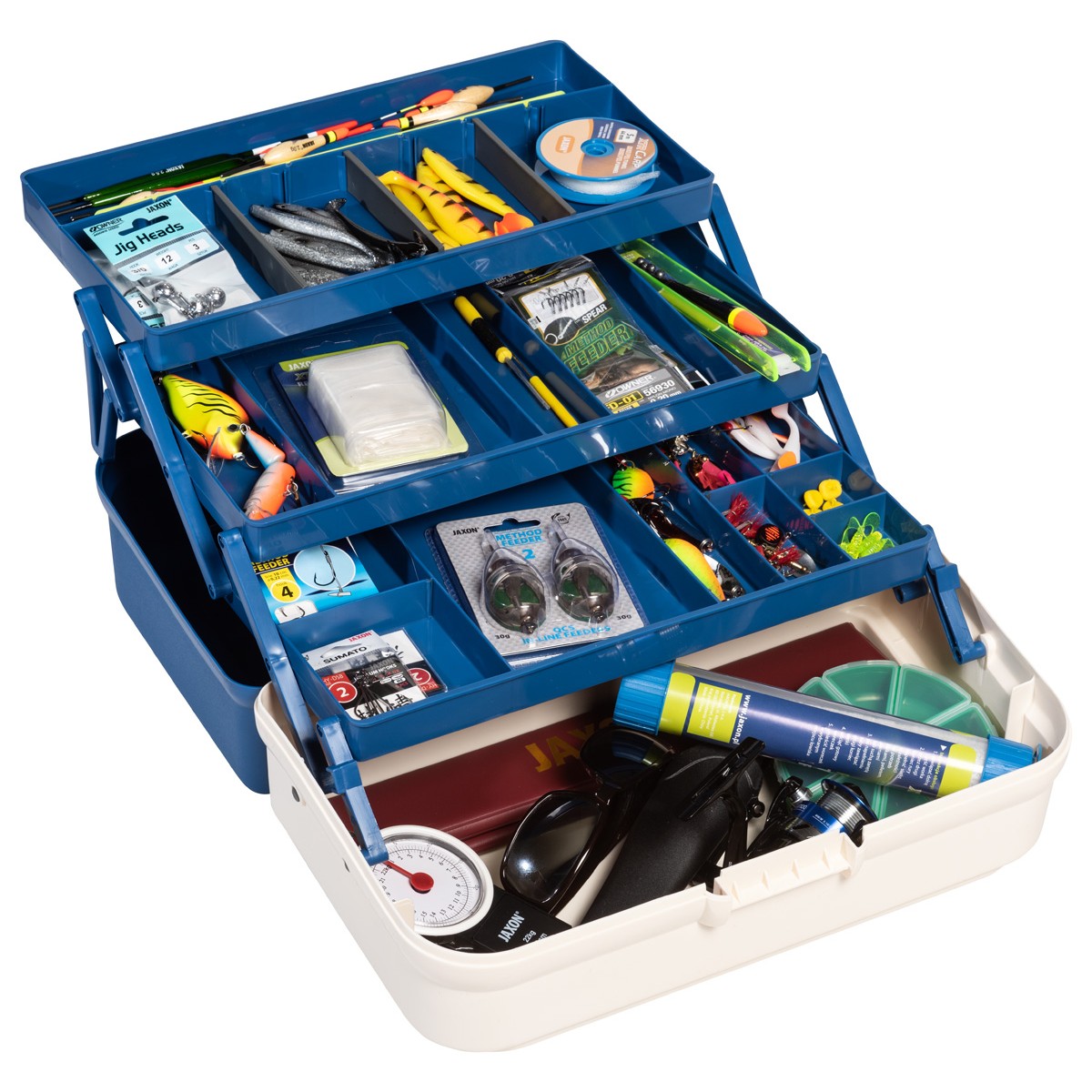 Większa skrzynka wędkarska z trzema szufladami.