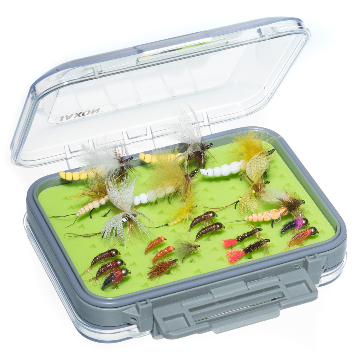 Pudełka muchowe dwustronne z uszczelkami zabezpieczającymi przed wilgocią. Wewnętrzne powierzchnie z nacięciami wykonano z gumy, co zapobiega nasiąkaniu środka wodą i w przypadku zamoczenia szybko schnie. W ofercie dwie wielkości z jedną wersją powierzchni wewnętrznej.