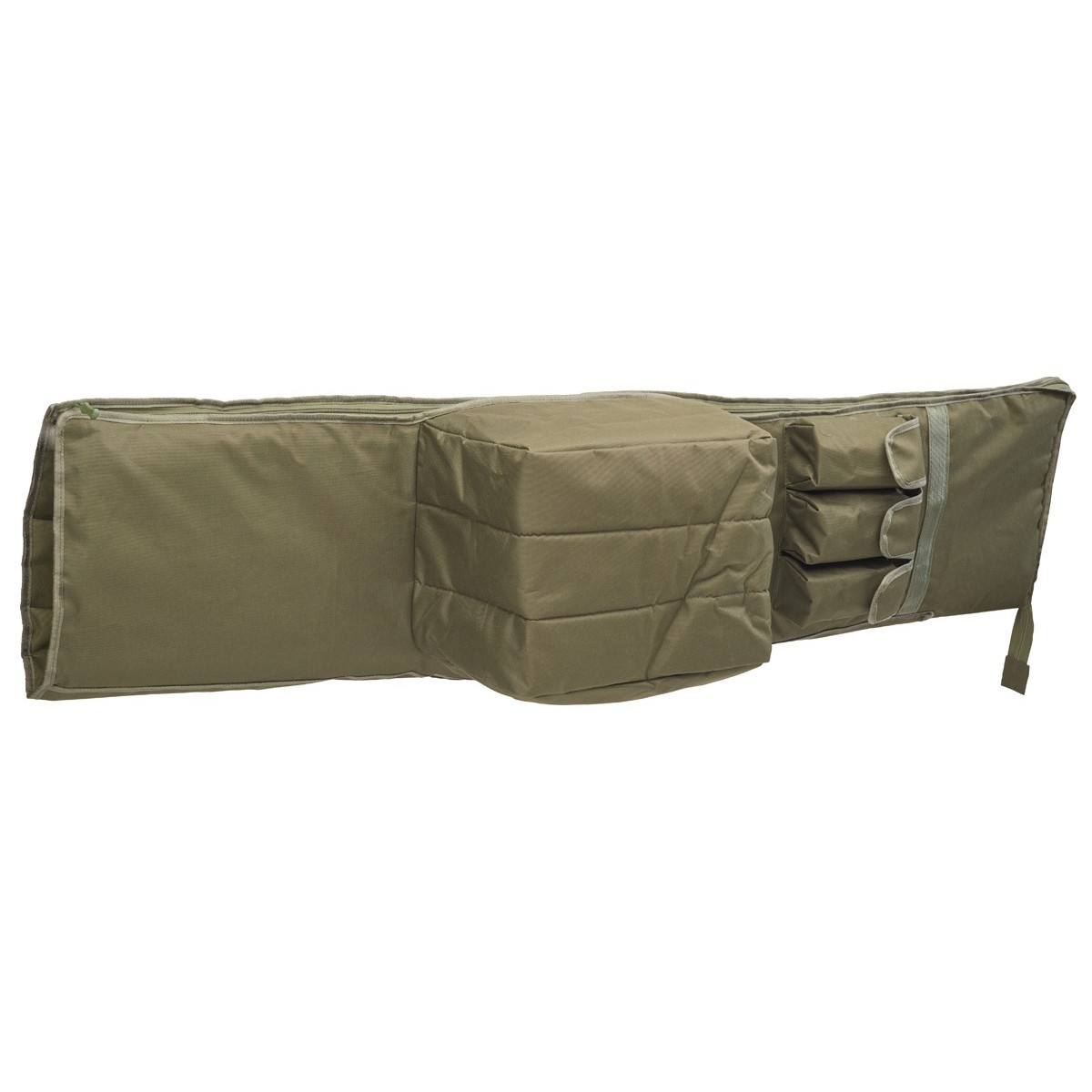 Podszyty miękką gąbką pokrowiec zaprojektowany z myślą o transporcie do trzech uzbrojonych wędek karpiowych. Dwie podłużne kieszenie z łatwością pomieszczą podpórki i podbierak. Wyposażony jest w kolejne trzy mniejsze kieszenie na akcesoria.
