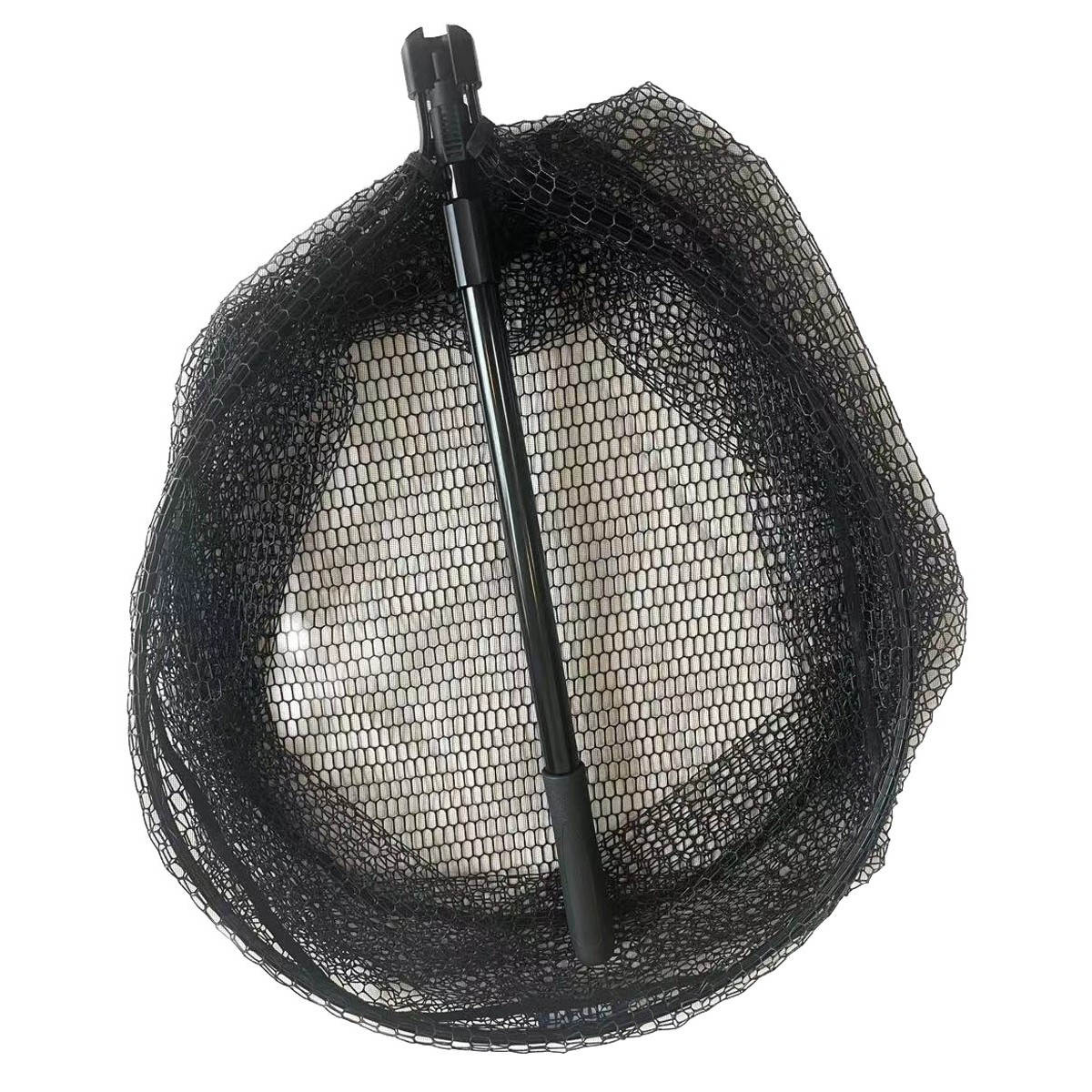 Składany teleskopowy podbierak w kolorze czarnym, z okrągłą głową i gumowaną siatką o głębokości aż 60 cm. Nowy zamek blokujący zapobiega przypadkowemu złożeniu głowy podbieraka w trakcie użytkowania i ułatwia jego transport.